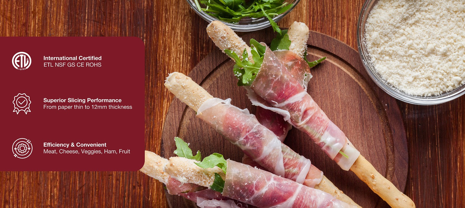 Beswood slicer is perfect for commercial use in restaurants, commercial kitchens, cafes and in-home use as well. It is able to slice boneless meat, cheese, ham, veggies with high standard performance.